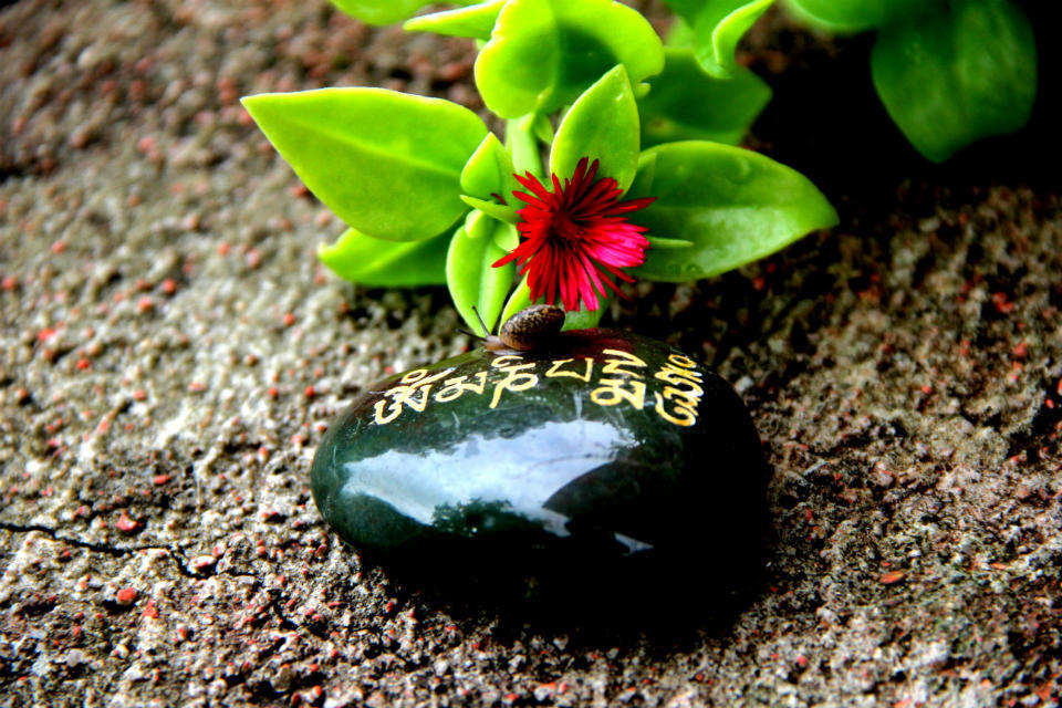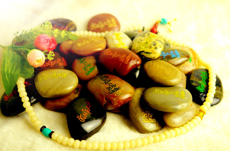 观音心咒“嗡玛尼呗美吽”是观世音菩萨的微妙本心的化现,见闻觉受的众生都能究竟解脱。将此咒刻在石头上则为玛尼石。玛尼石是十方诸佛菩萨的真实化现,所在之处等同于一尊菩萨在那里恒行利生事业。